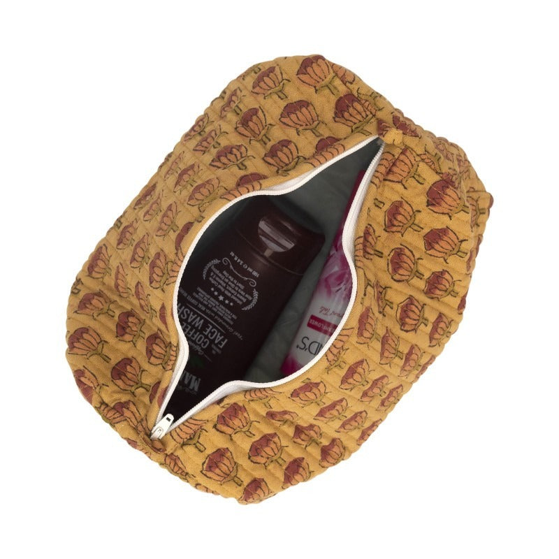 Classic, earthy, and beautifully traditional—this quilted pouch features a repeating handblock-style buta motif in warm rust and olive tones on a mustard base. The heritage-inspired pattern gives it an ethnic charm, while the quilted texture offers softness, structure, and lasting durability.