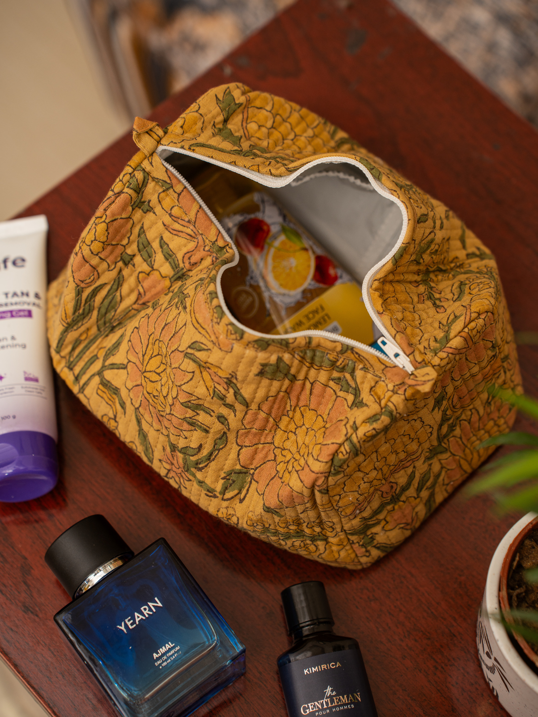 Rich, earthy, and full of artisanal charm—this quilted pouch features a beautiful floral print in muted tones of mustard, peach, and olive green. The traditional hand-drawn style of the motifs gives it a vintage elegance, while the quilted texture adds structure and a soft, cushioned feel.