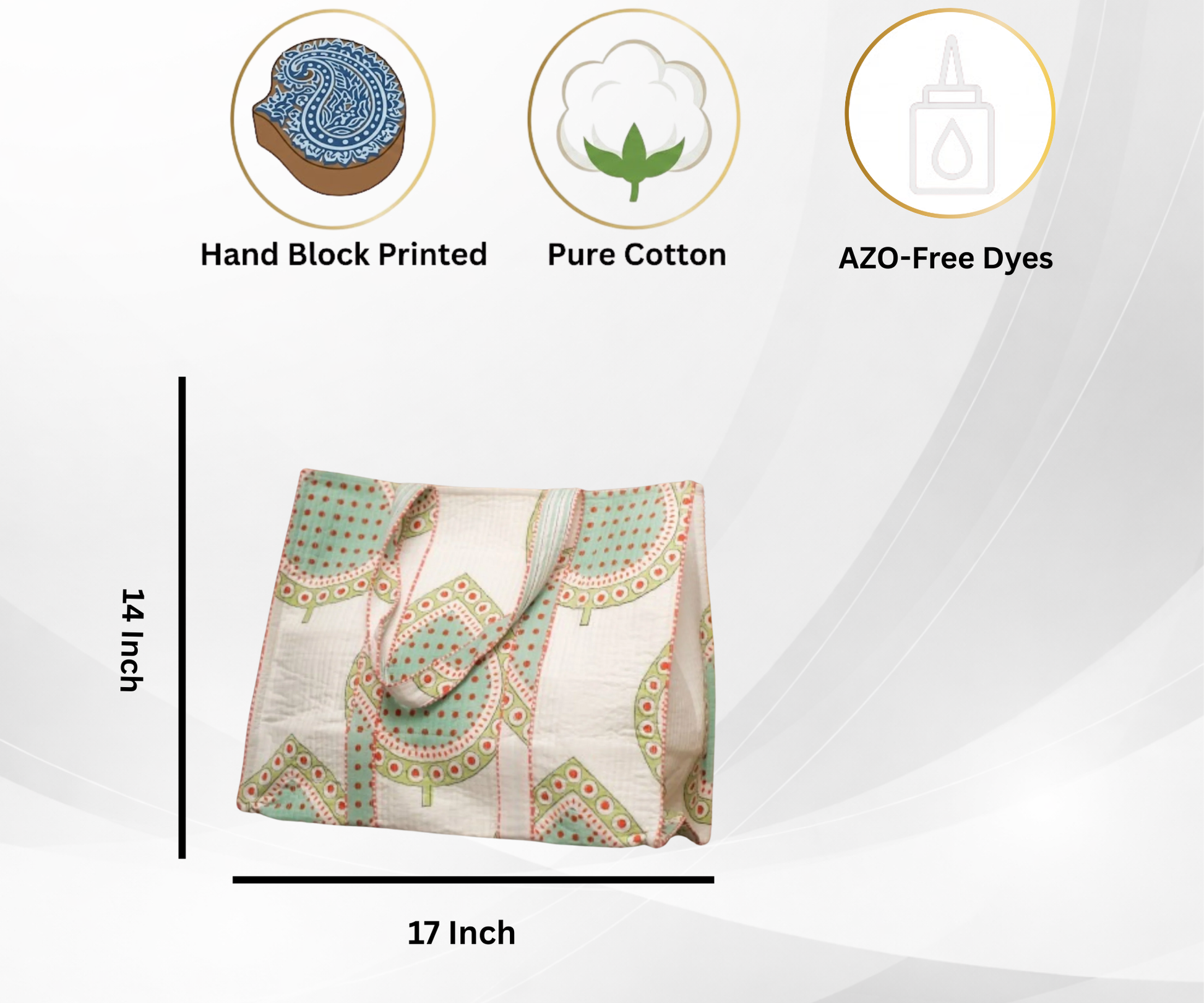 Brighten your everyday routine with this beautifully hand block–printed cotton tote bag, showcasing a refreshing blend of mint green, soft red, and cream tones. The geometric fan-arch pattern with delicate dotted detailing adds a playful yet elegant touch, highlighting the artistry of traditional block printing.
