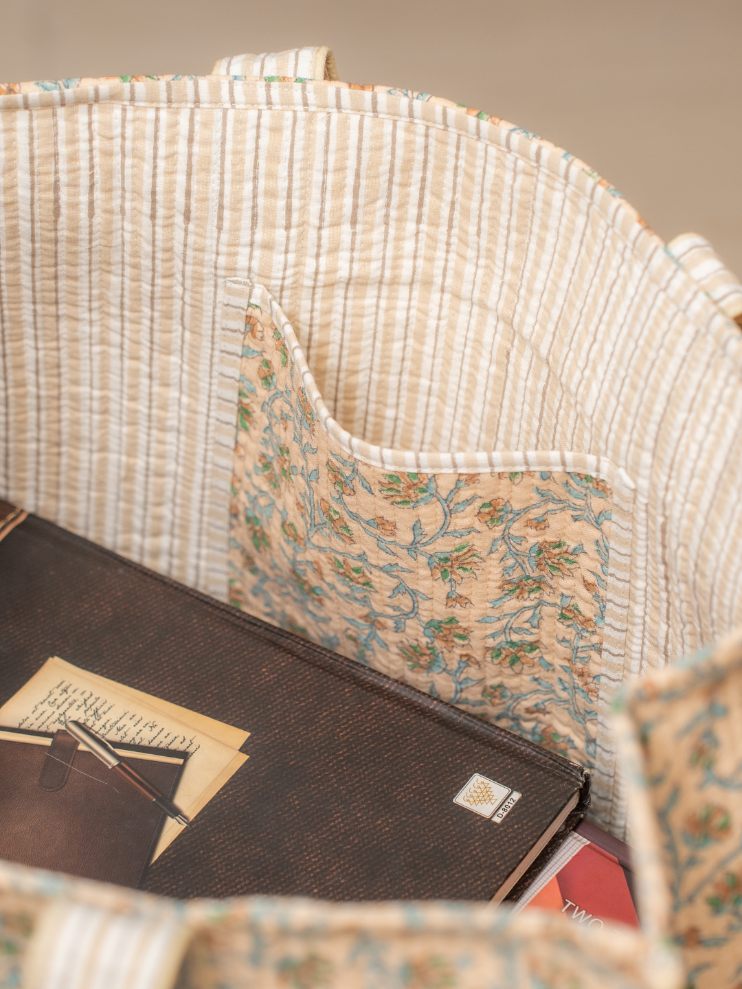 Soft, subtle, and effortlessly elegant — the Beige Blossom Tote Bag features a delicate botanical print in earthy tones, giving it a timeless and graceful appeal. Crafted from premium quilted fabric, this tote is lightweight yet durable, making it perfect for daily errands, shopping, or casual outings.