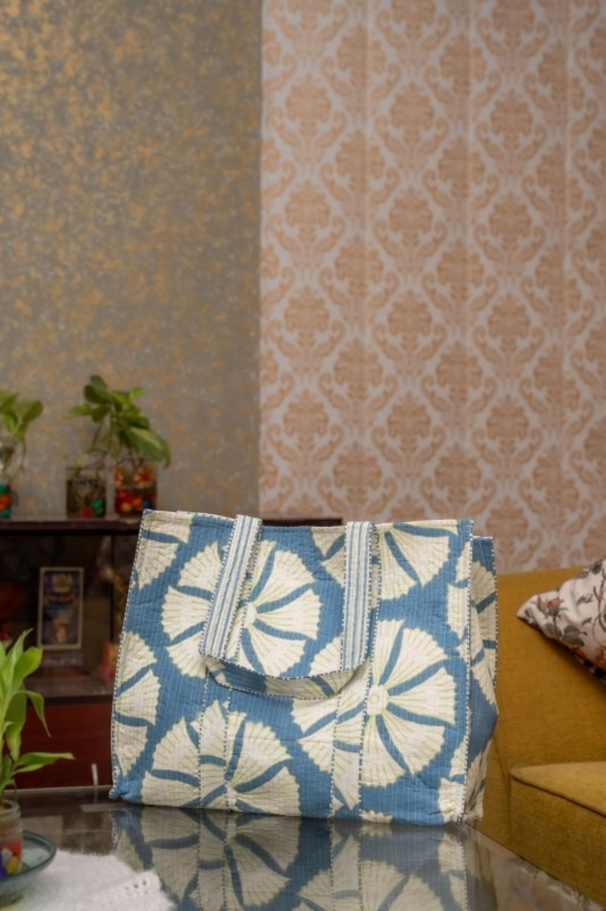 Add a touch of artistic elegance to your everyday carry with this beautifully hand block–printed cotton tote bag, featuring striking fan-shaped floral motifs in soothing cream tones set against a calming blue backdrop. The bold, symmetrical pattern highlights traditional craftsmanship while giving the bag a fresh, contemporary appeal.