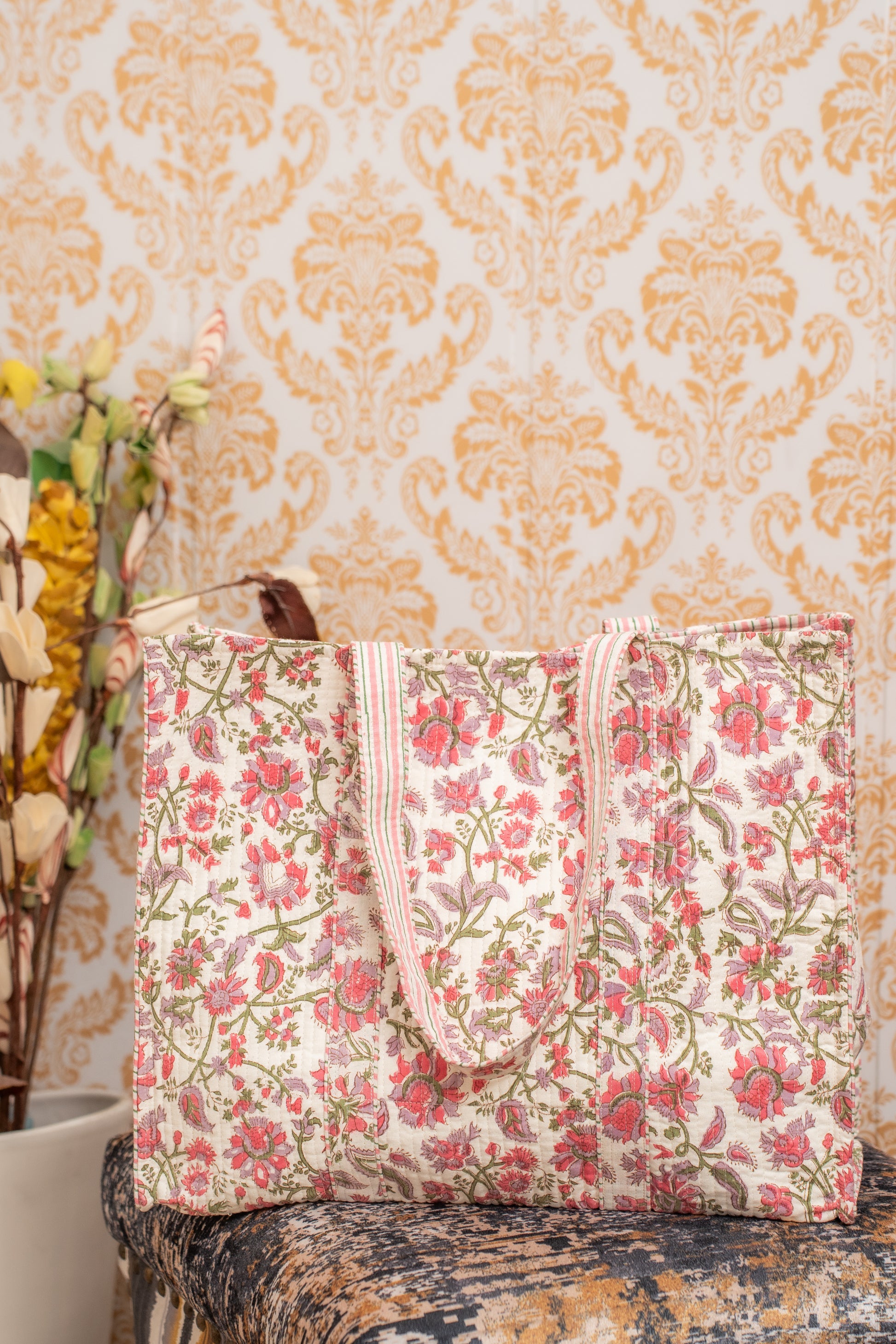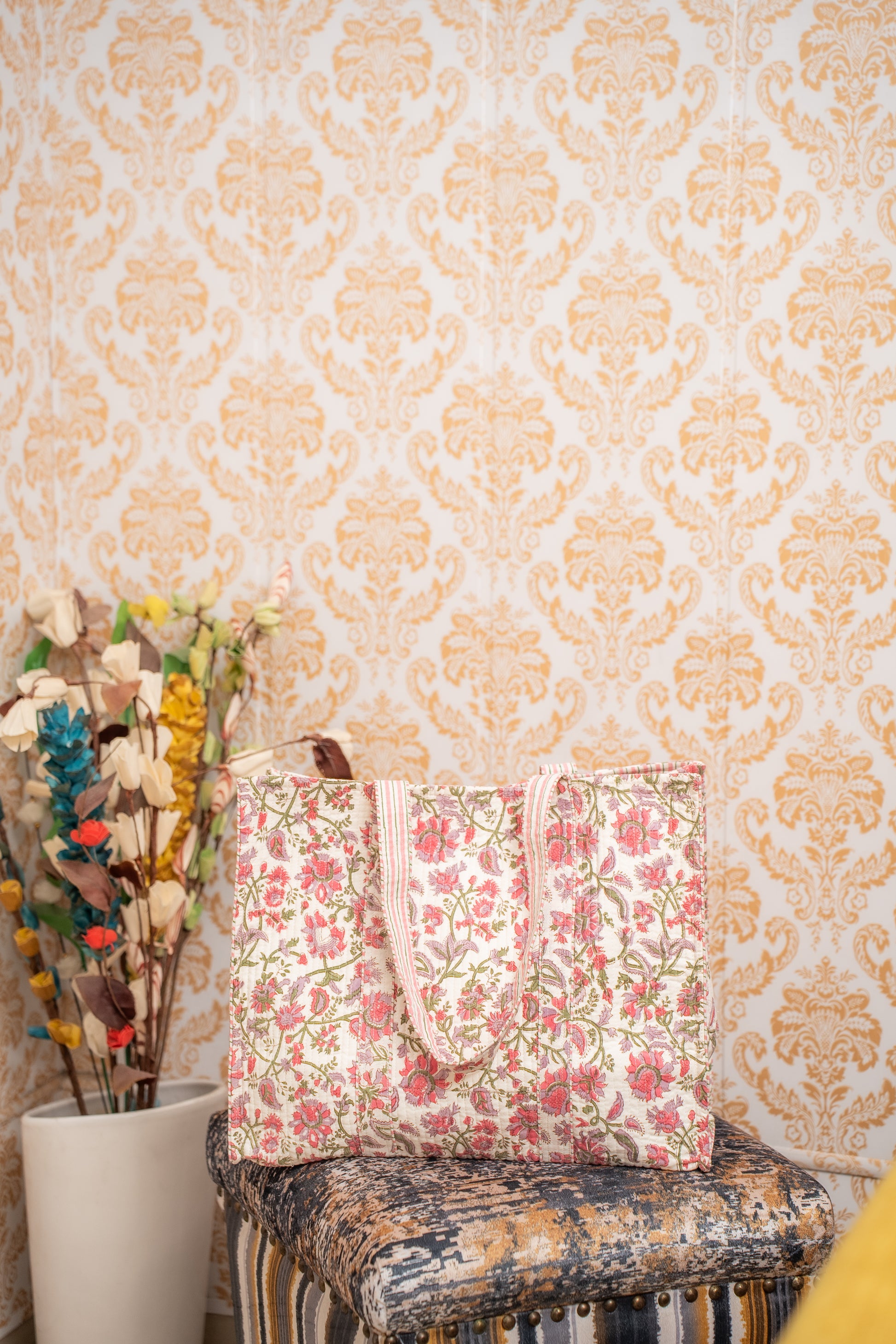 Awdhesh Kumar Blush Bloom Carryall Cotton Hand Block Printed Tote Bag for Women