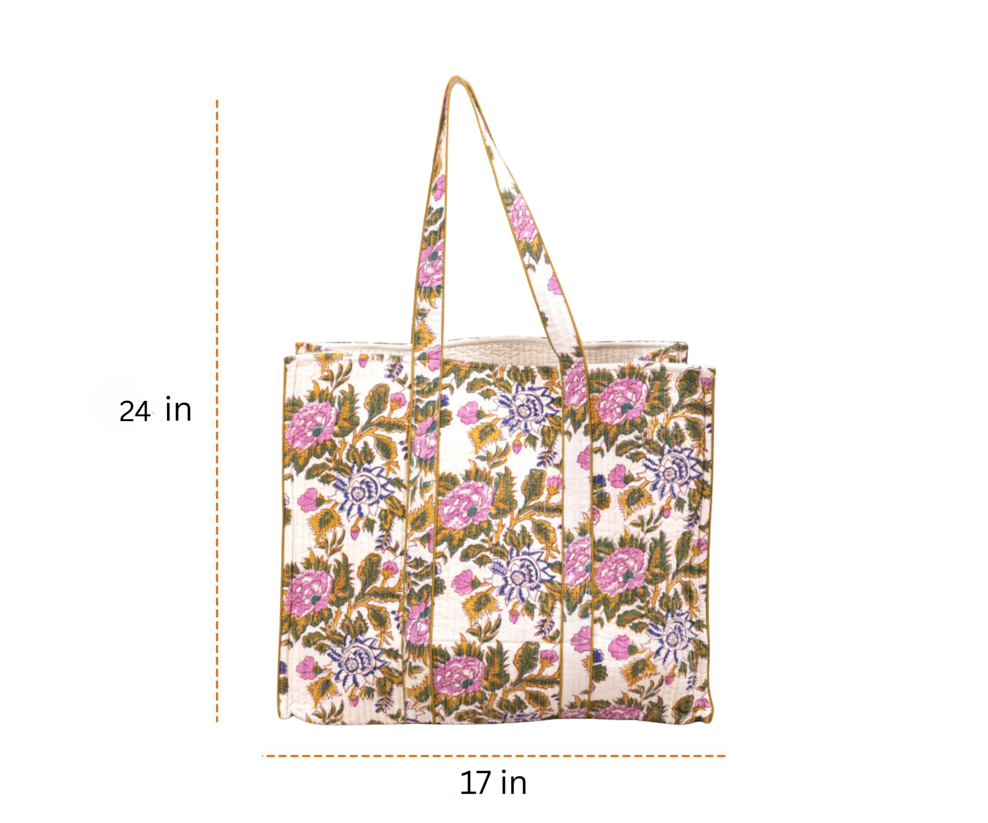 Bring charm and convenience together with this beautifully crafted quilted tote bag. Designed on an ivory base, it features bold floral motifs in purple, blue, and green that add a refreshing handcrafted appeal. The spacious silhouette makes it perfect for travel, shopping, work, or daily use, while the sturdy double straps ensure comfortable carrying. Made with soft quilted fabric for extra durability and a lightweight feel, this tote blends style with everyday practicality. Whether you’re heading out for errands or a weekend outing, this floral bag makes a graceful companion.