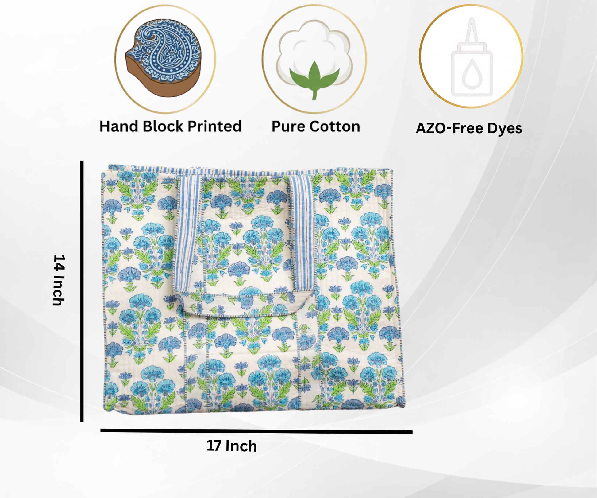 Discover the artisanal charm of this hand block printed cotton tote bag featuring an exquisite floral pattern with bold daisies in green and red hues. The spacious dimensions of 42 cm x 35 cm x 19 cm provide a generous 15-litre capacity, perfect for daily essentials and shopping needs. This versatile tote showcases intricate floral patterns created through traditional block printing techniques, complemented by distinctive striped accents along the straps. Practical features include a secure main zippered compartment, two convenient pockets for organisation, and double cotton shoulder straps with a 25 cm drop length for comfortable carrying.