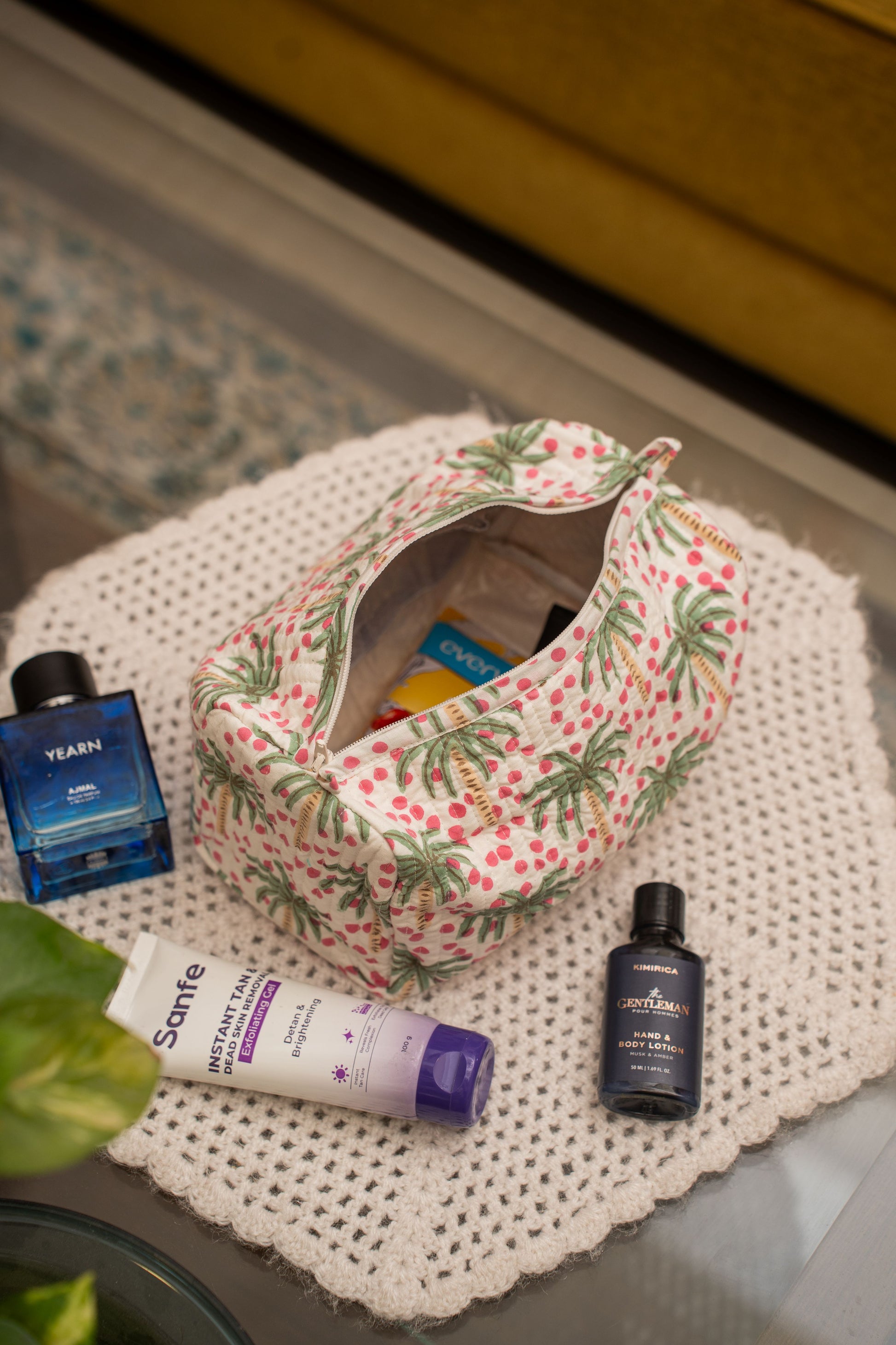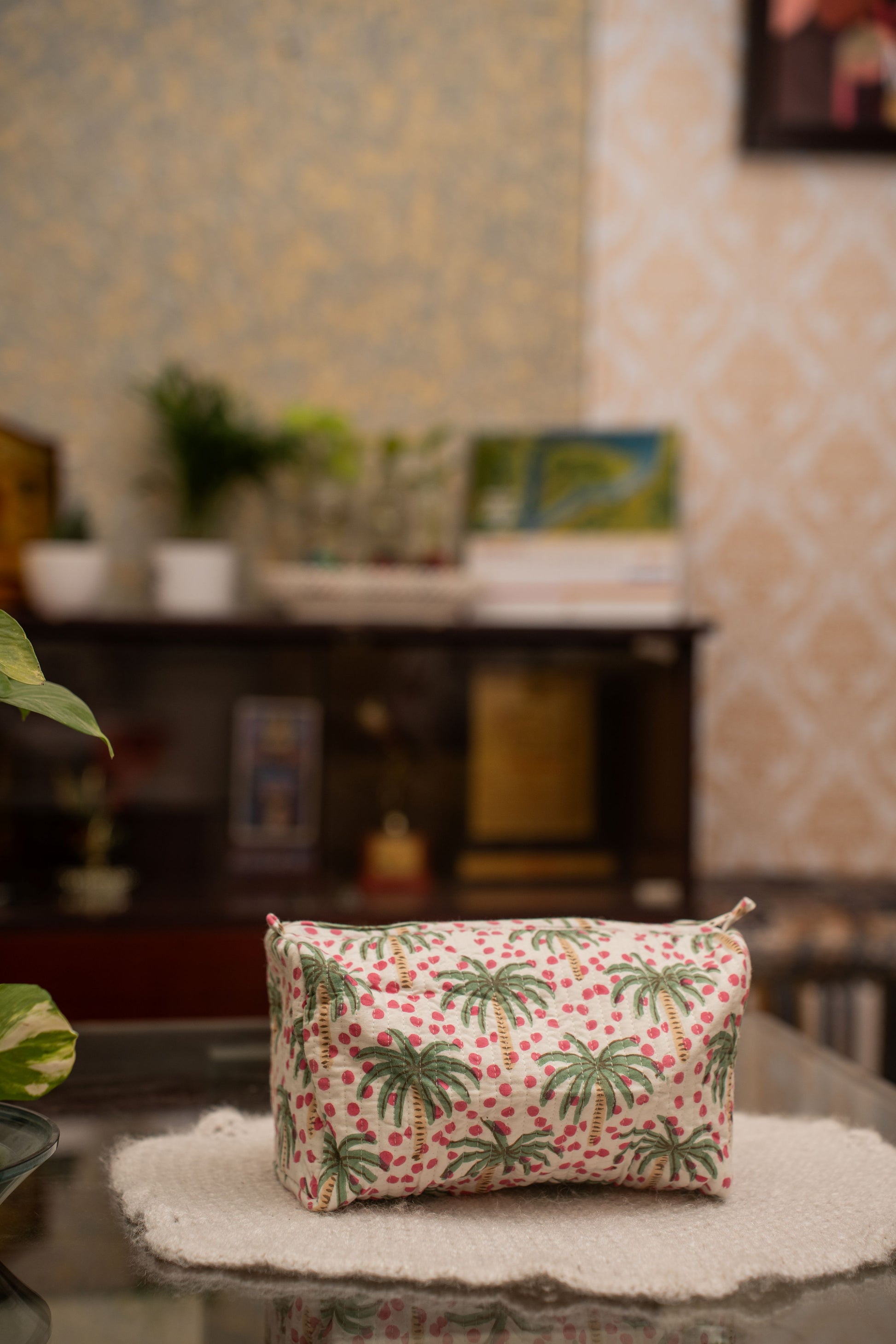 Celebrate the refreshing charm of this hand block–printed cotton toiletry bag, beautifully adorned with delicate green palm trees and playful pink berry motifs. The tropical-inspired pattern is crafted using traditional block-printing techniques, giving the bag an artistic, nature-inspired appeal.