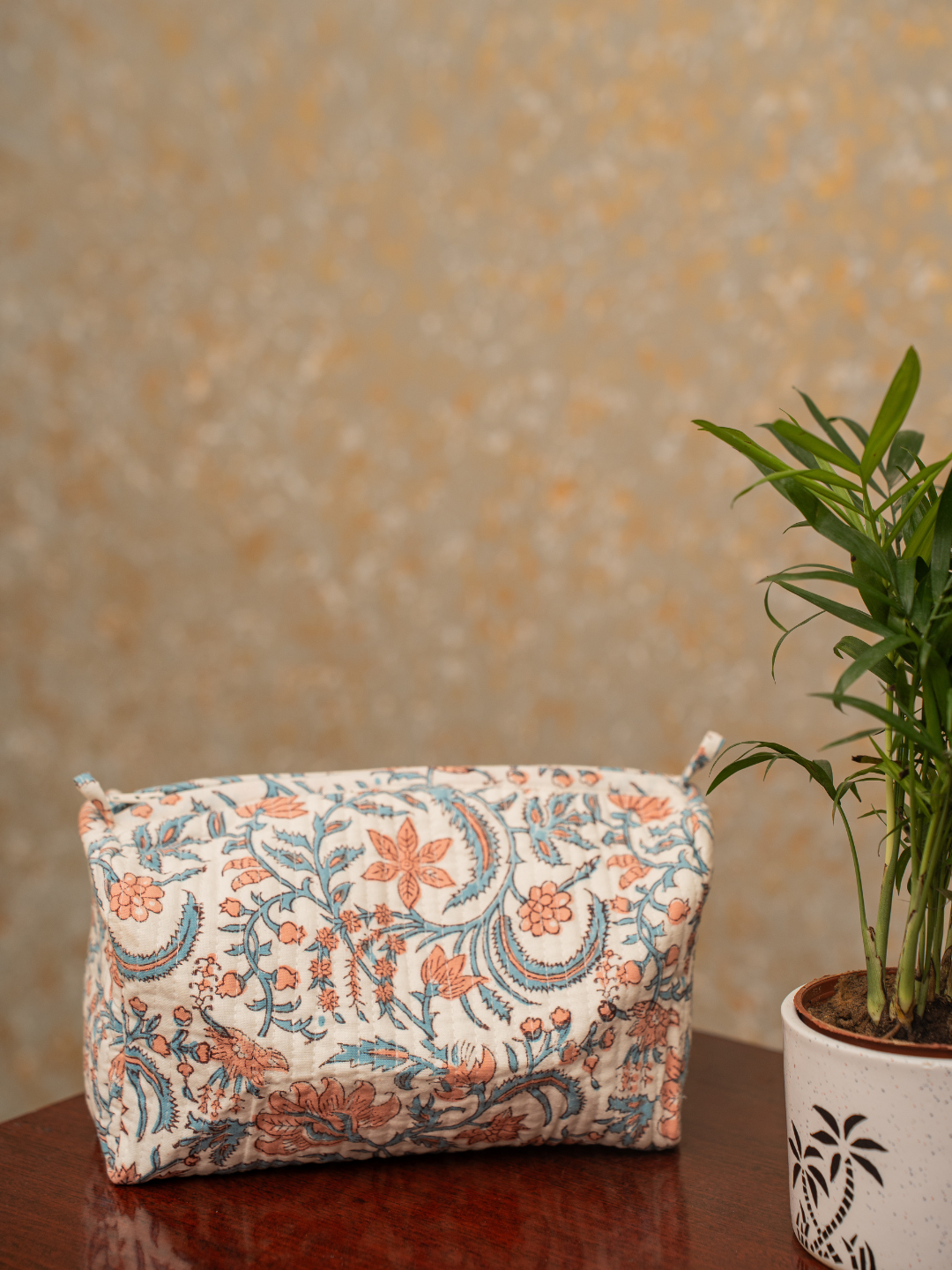 A soft, elegant accessory crafted for everyday convenience—this quilted pouch features a delicate blend of blush pink and teal floral motifs on an ivory background. The hand-drawn vine pattern adds a vintage charm, while the quilted texture gives it a cozy, cushioned feel.