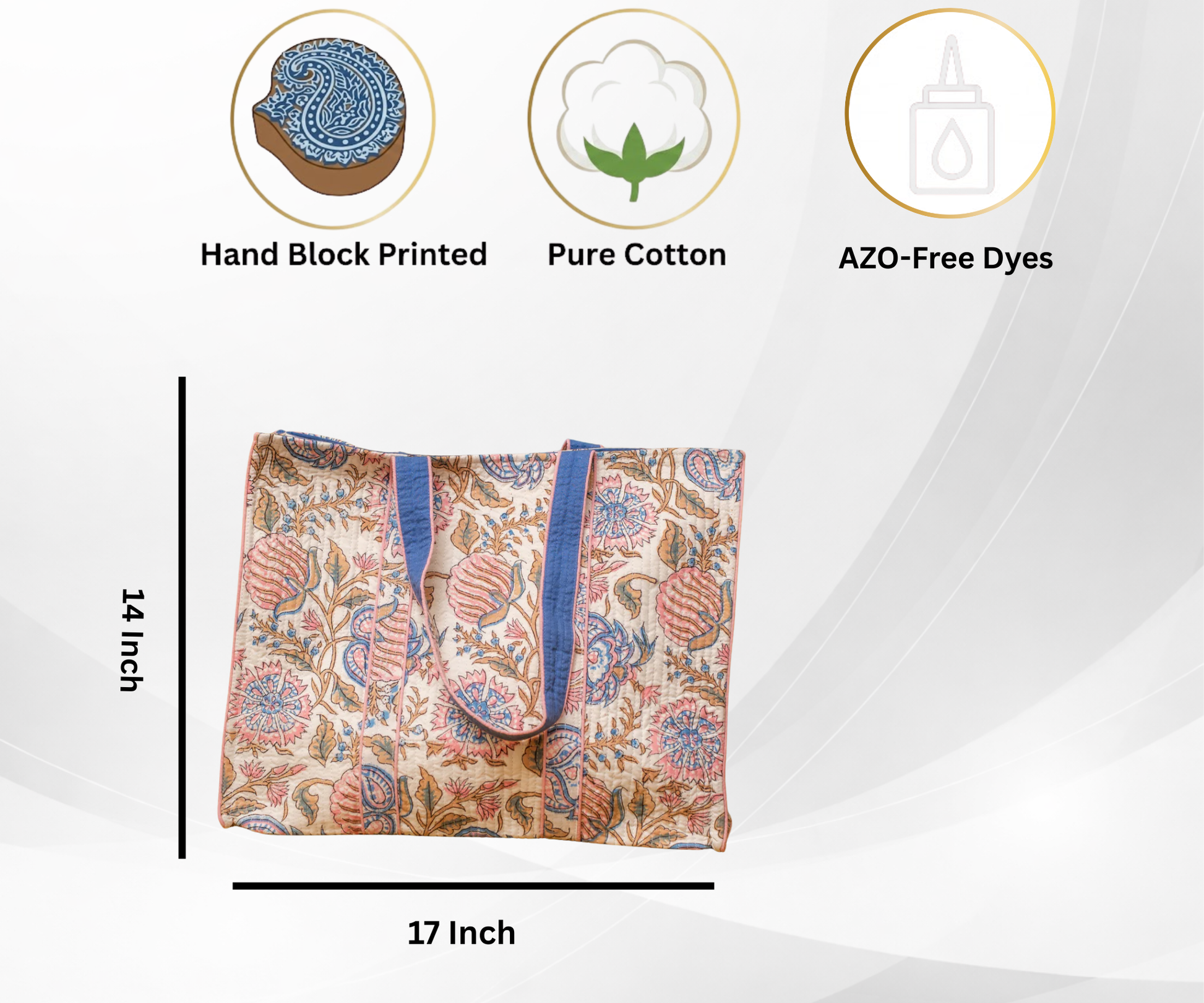 Bring home a touch of timeless artistry with the Royal Pomegranate Tote Bag. Inspired by traditional Indian block-print motifs, this bag features intricate floral and pomegranate patterns in warm, earthy tones. The contrasting blue handles add a modern pop of color while offering a sturdy and comfortable grip.