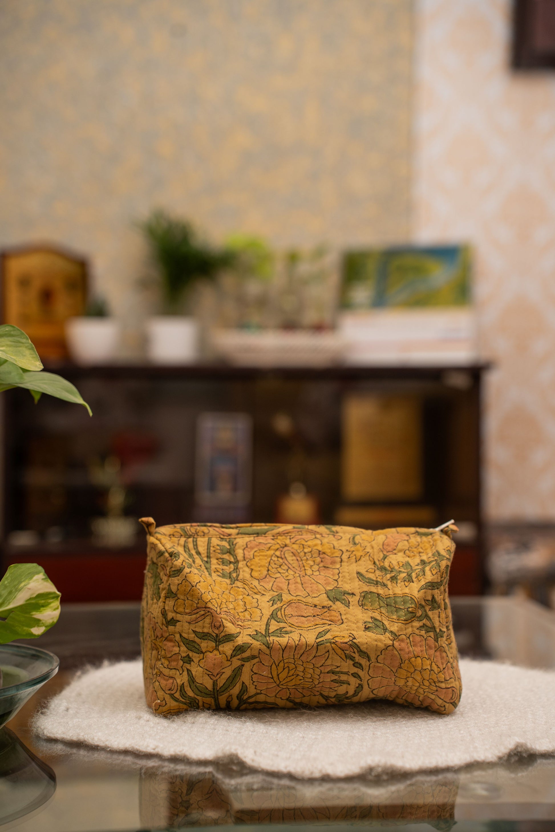 Discover the handcrafted elegance of this hand block–printed cotton toiletry bag, featuring a warm mustard base adorned with blooming peach and green floral motifs. Each pattern is created using traditional block-printing techniques, giving the bag a rich artisanal character and a timeless, heritage-inspired charm.