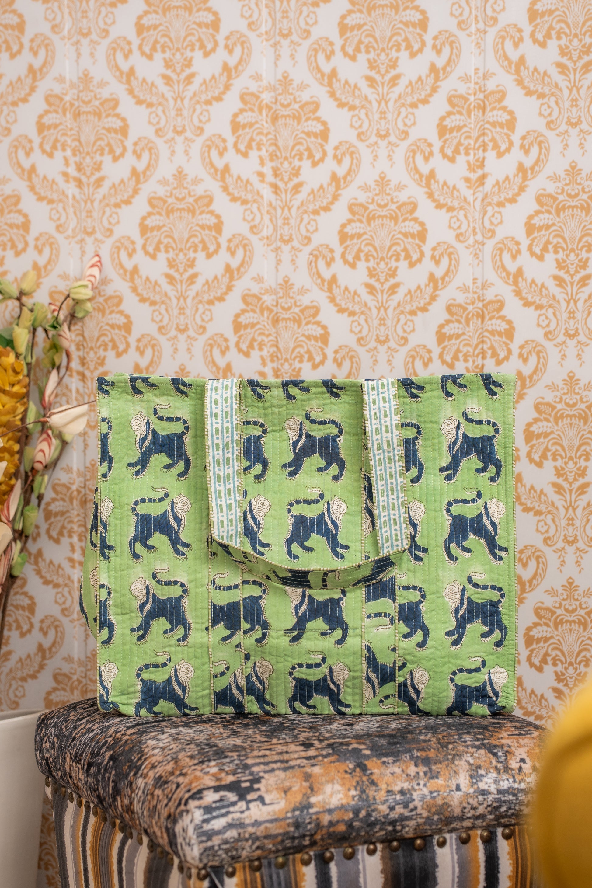 Discover the artisanal charm of this hand block printed cotton tote bag featuring an exquisite floral pattern with bold daisies in green and red hues. The spacious dimensions of 42 cm x 35 cm x 19 cm provide a generous 15-litre capacity, perfect for daily essentials and shopping needs. This versatile tote showcases intricate floral patterns created through traditional block printing techniques, complemented by distinctive striped accents along the straps. Practical features include a secure main zippered compartment, two convenient pockets for organisation, and double cotton shoulder straps with a 25 cm drop length for comfortable carrying.