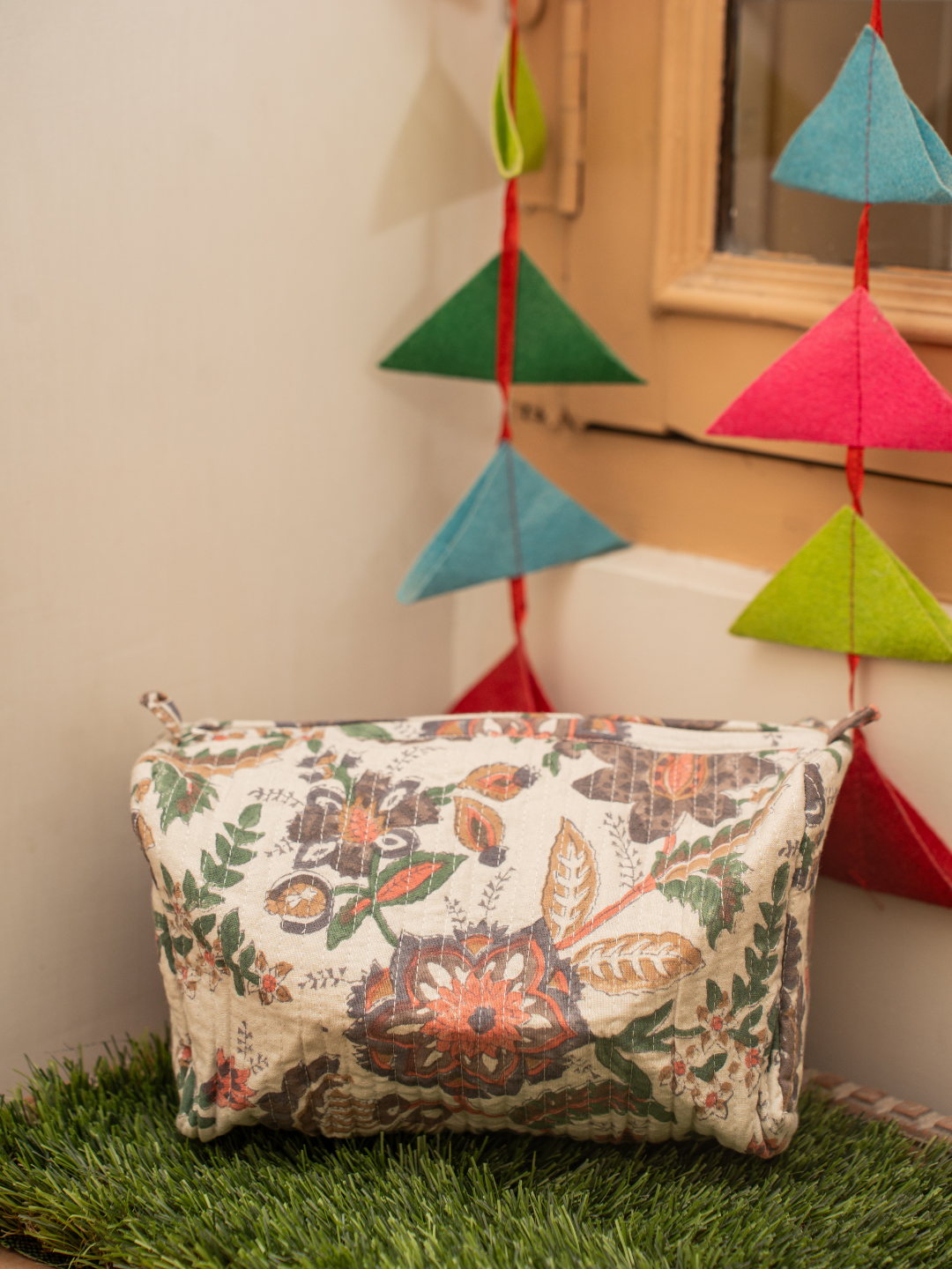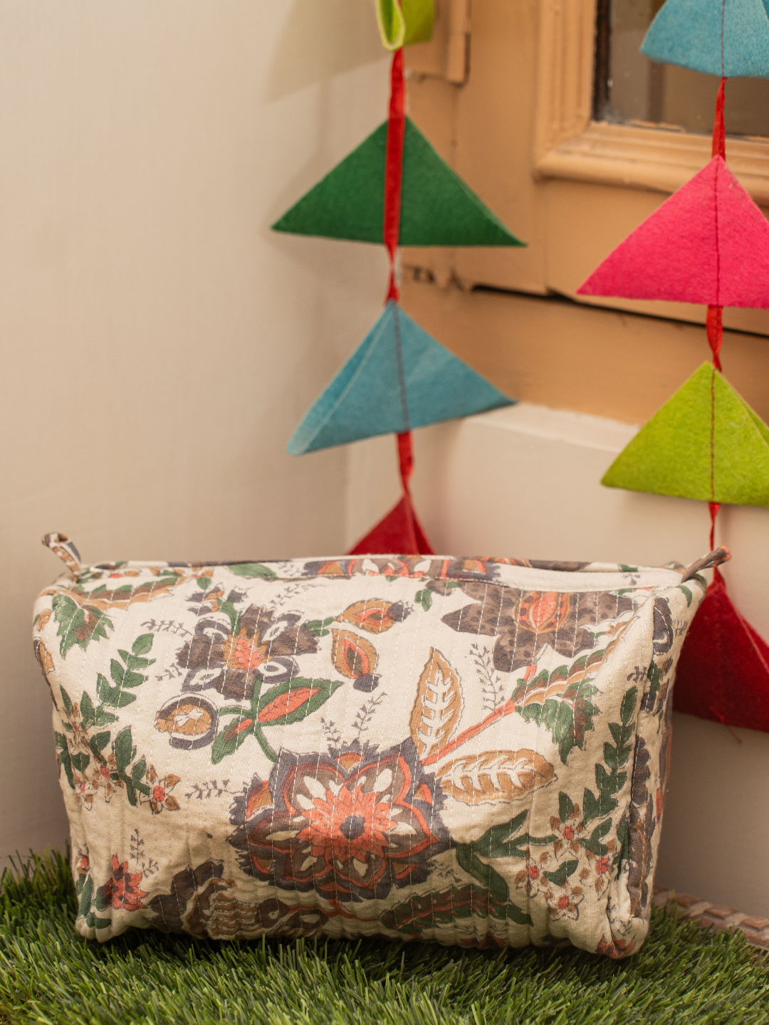 Warm, earthy, and beautifully artisanal—this quilted pouch features a hand-drawn floral and botanical print in tones of terracotta, olive, charcoal, and soft orange. The natural, heritage-inspired artwork gives it a rustic charm, while the quilted texture offers both softness and durability.