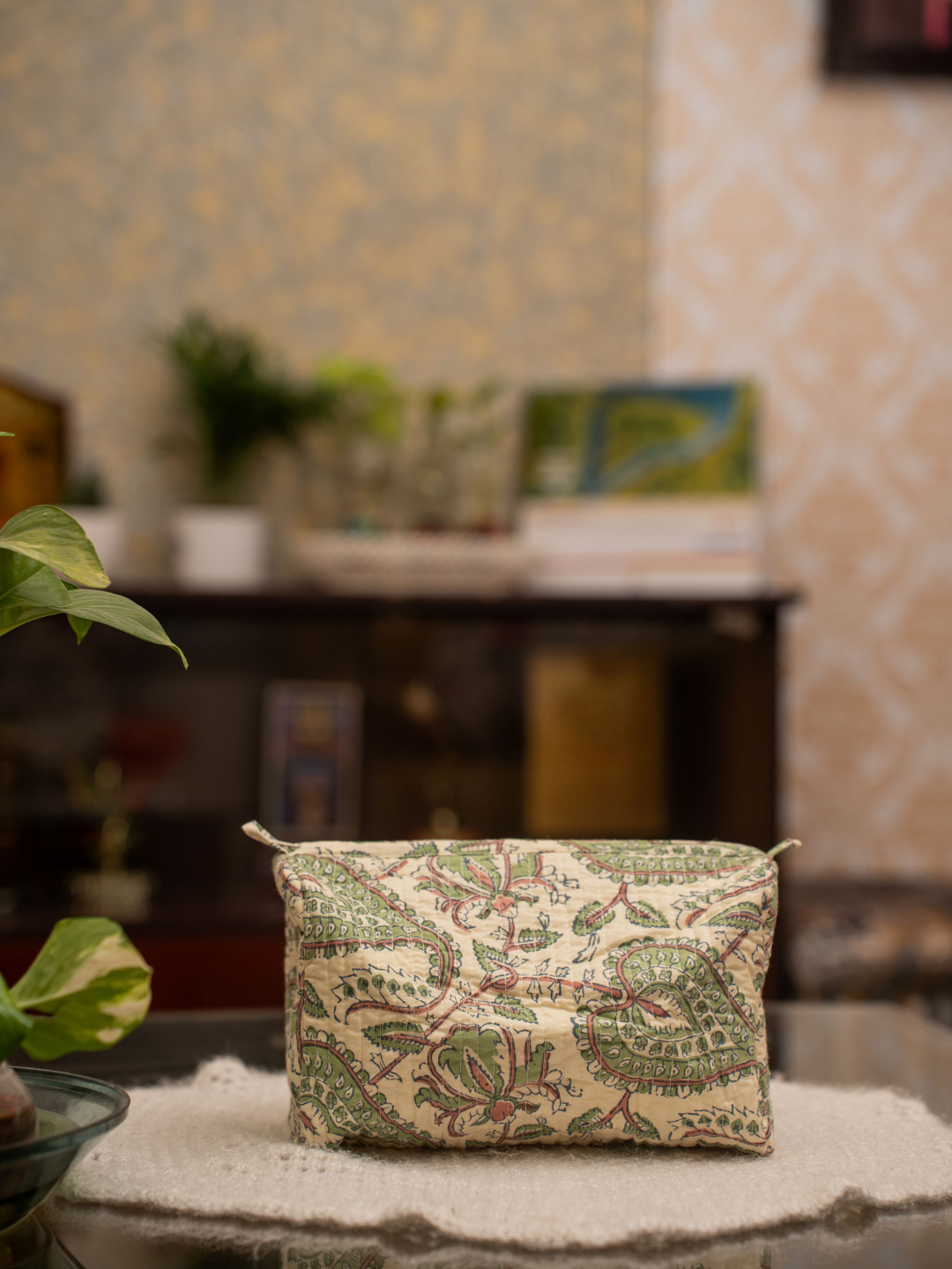Experience the handcrafted elegance of this hand block-printed cotton toiletry bag, adorned with an intricate floral and leaf pattern in soothing green and soft red tones. Skillfully created using traditional block-printing techniques, it brings a touch of artisanal charm to your everyday essentials.