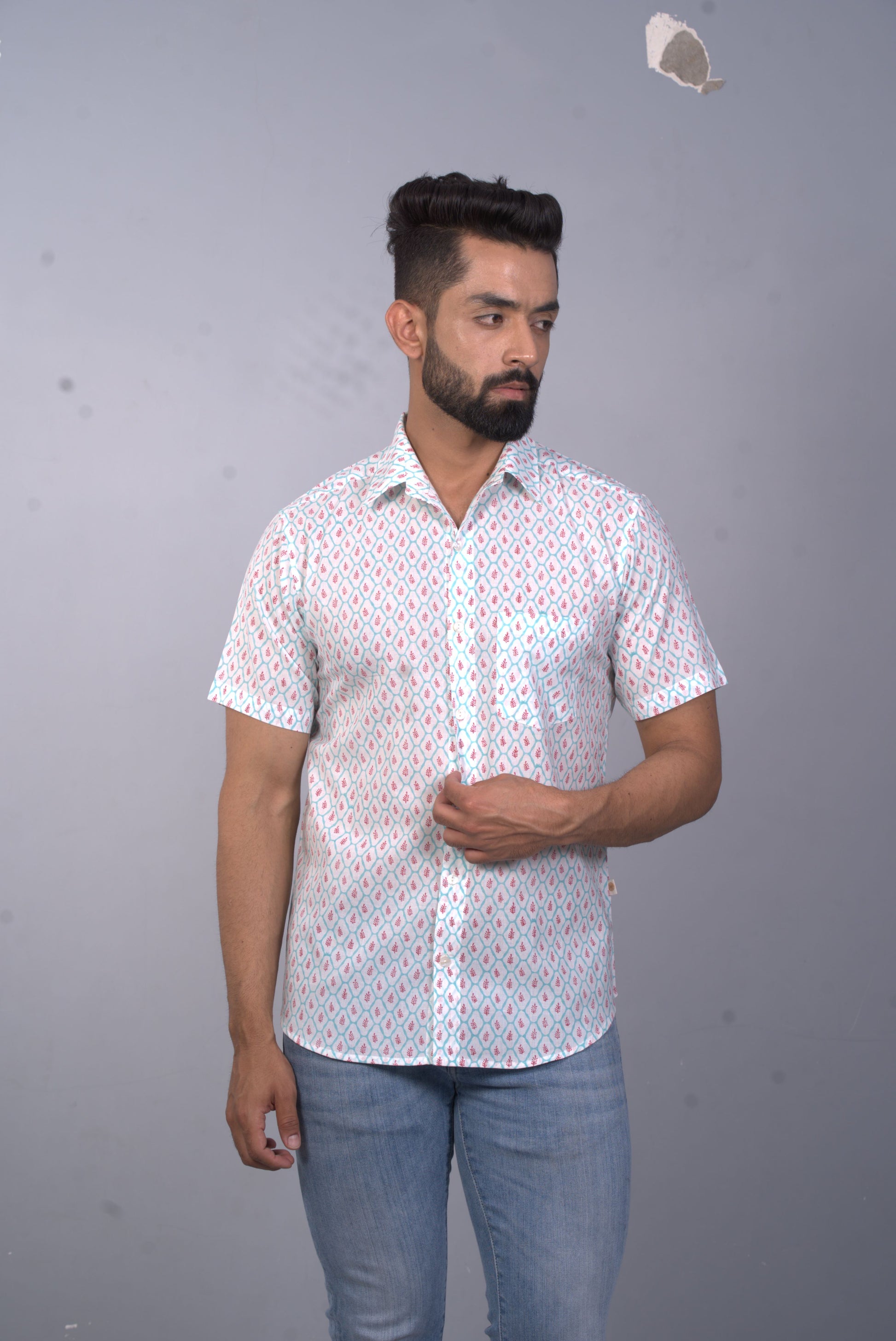 This is hand block printed men's half sleeve shirt, printed by using traditional hand block printing This is hand block printed men's half sleeve shirt, printed by using traditional hand block printing technique, on 100% cotton 60's cambric fabric, with free pigment dyes.