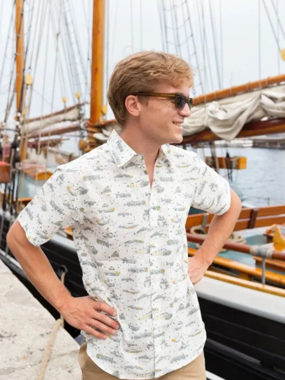 This is a short-sleeve button-down shirt featuring a white base with an all-over illustrated transport-themed pattern. The print includes small drawings of cars, buses, scooters, and other vehicles in soft grey and yellow tones, giving it a retro, playful, and casual look.