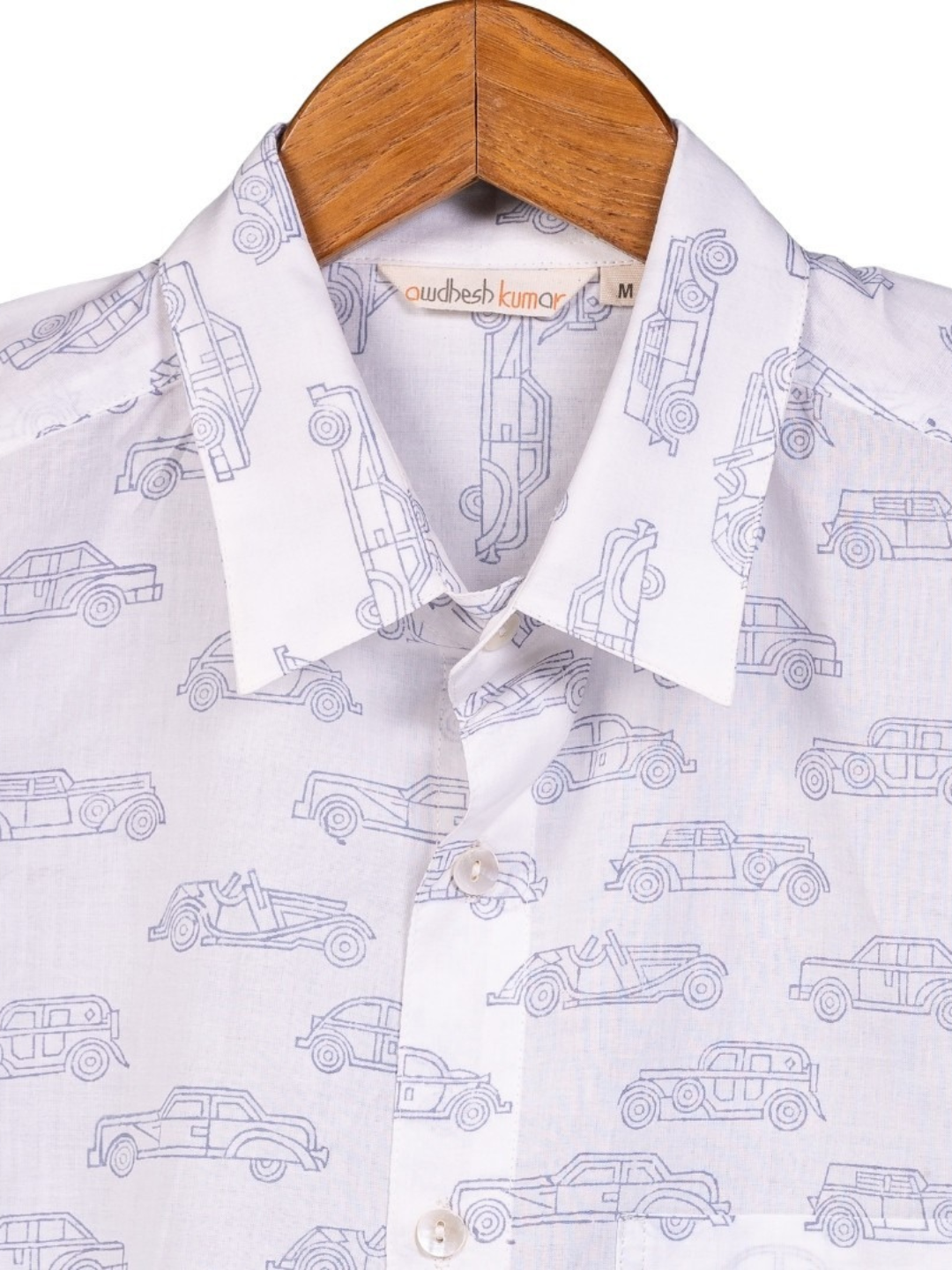 The subtle blue car sketches on a crisp white background give it a clean, modern, and youthful vibe. Crafted from soft, breathable fabric, it offers a relaxed yet polished look suitable for casual outings, weekend wear, or even light office days.